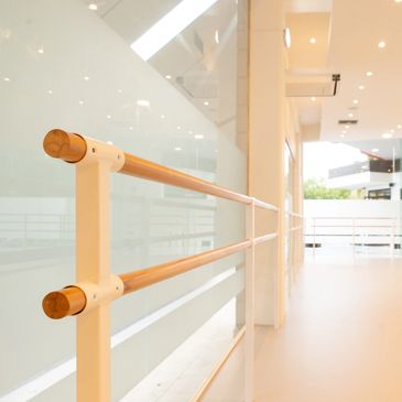 Η ευρύχωρη αίθουσά μας διαθέτει ξύλινες μπάρες δυο επιπέδων για παιδιά και για ενήλικες και είναι μόνιμα τοποθετημένες στο δάπεδο.